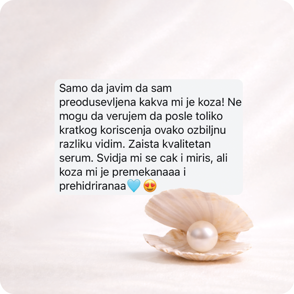 Sastav: aqua, glycerin, d-pantenol, pearl powder, hyaluronic Acid MMW, Sodium hyaluronate HMW, allantoin, Benzyl Alcohol, Dehidroacetic acid, parfum